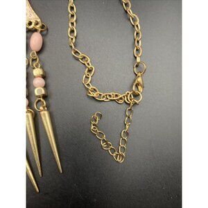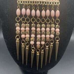 Victorian Style Bib Necklace Pink Enamel Panel Beaded Fringe Gold Tone 19" Boho