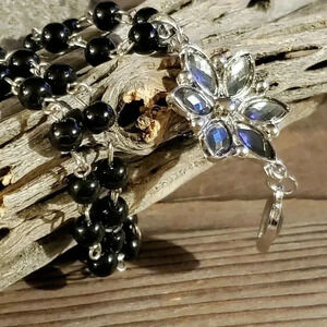 Victorian Style Black Silver and Smoke Navette Flower Pendant Necklace