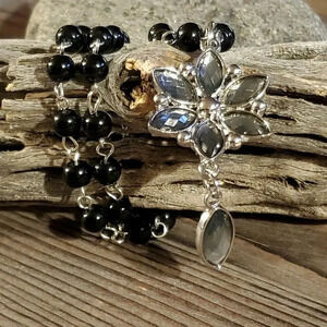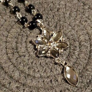 Victorian Style Black Silver and Smoke Navette Flower Pendant Necklace