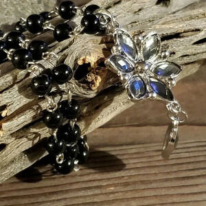 Handcrafted necklace features glass and resin beads and baubles