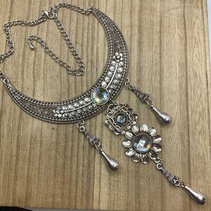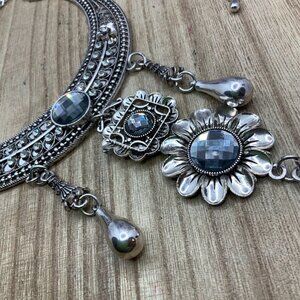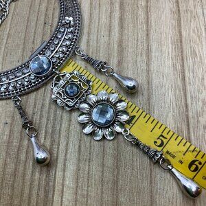 Victorian Style Floral Rhinestone Silver Tone Dangling Collar Necklace