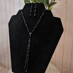 Victorian style gunmetal lariat necklace with black beads. Dangle earrings match the necklace.