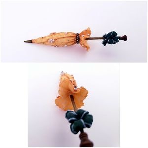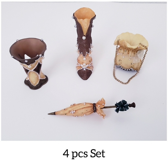 4 pcs Beautiful Victorian Style Resin Shoe, Purse Umbrella Steampunk Jester Boot figurine Set. In great condition, only has 1 flaw from the umbrella handle which was fixed as shown in picture. these are very little delicate figurines and perfect for show pieces.