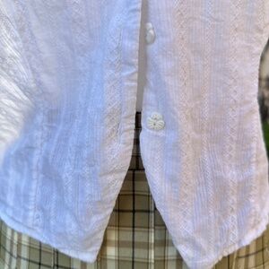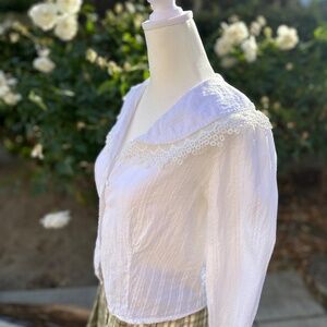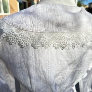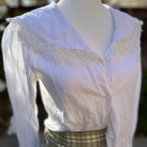 Miss Patina Eyelet Button Down Blouse white victorian style top with functional flower shaped buttons. Perfect for layering. Usually styled with a pinafore. Fits size 2/XS (usa sizing) & tag says UK size 6. Not much stretch. #buttonuptop #1970s #vintage #shirt #officesiren
