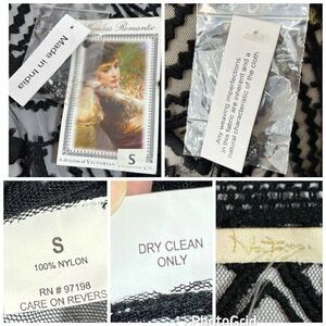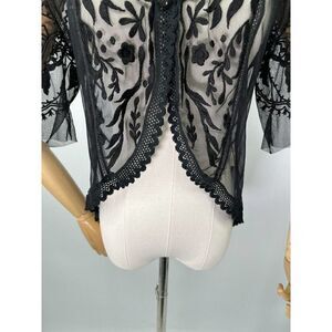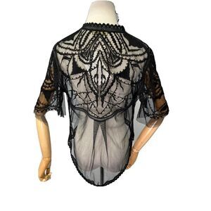 New with tags. The Victorian Trading Co. Hopeless Romantic Natayla Black Sheer Lace Cover Top Shrug with hook and eye closure with two decorative buttons on clothing and a back up in baggie with tags. Size Small. Measurements in photos. Hopeless Romantic. Perfect timeless piece for most any elegant occasion. Measurements in photos. No rips, holes, or stains. Comes from smoke free environment.