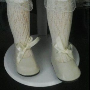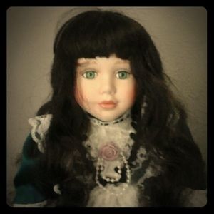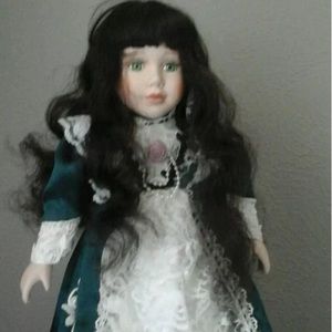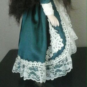 She wears a beautiful emerald dress with white Chantilly lace. She has green eyes and dark brown hair and her boots are white with stockings.