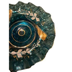 Beautiful rare Victorian hand blown Glass Ruffled edge gilt dish that is hand painted with flowers. Paint and gilt are in beautiful condition and no chips or cracks. This piece in in excellent condition and would make a beautiful addition to any collection . Packed and shipped carefully .