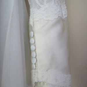 Vintage lace and chiffon wedding dress with a scalloped Queen Anne neckline, seed pearls on the bodice, sheer net long sleeves with lace appliques and a court length train.