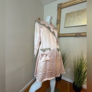 Vintage Victoria’s Secret gold label 1990s second skin liquid satin robe with long sleeves. This gorgeous piece comes in a soft pink color. It is an adorned with contrasting, scallop, floral, chantilly lace on the lapel, pockets, and at the bottom of the long sleeves. The robe has an internal tie and an external belt loops no belt included It has pockets on both sides of the robe.