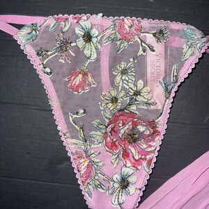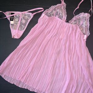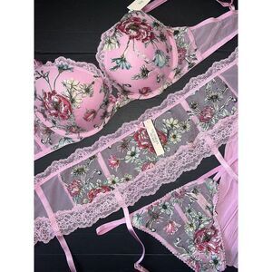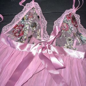 Victoria's Secret 34B BRA SET+garter+thong+S BABYDOLL gown PINK floral appliqué