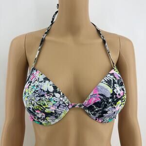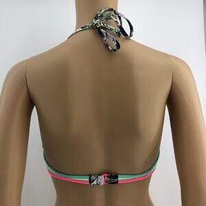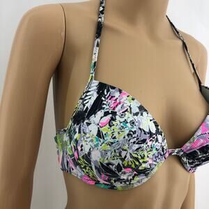 Victoria’s Secret (34C) Multicolor Black Floral Strappy Neon Pastel Halter Neck Bikini Swim Top
