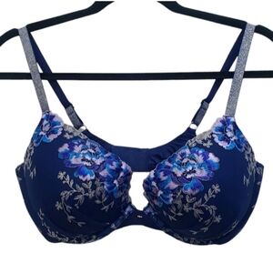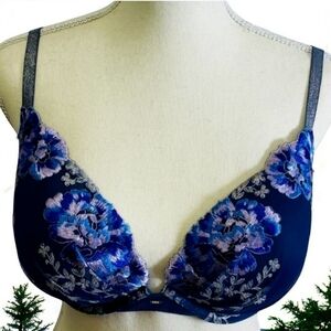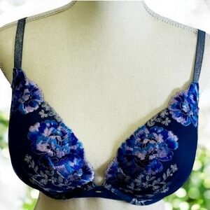 Victoria's Secret 36DD Dark Blue Flower Embroidered Embellished Plunge Bra