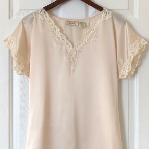 VTG and straight out of the 80s - This beautiful dainty slip dress features short drop shoulder sleeves, a v-neck, and a curved hem. It has an oversized, boxy fit and a mini length. The silky polyester is cream in color with a lace trim at the neckline and cuffs. Loose and flowy, it is lightweight and breathable, perfect for Spring and Summer! Great for warm weather! Very simple, classic, nostalgic and elegant. Chic, retro and high quality!