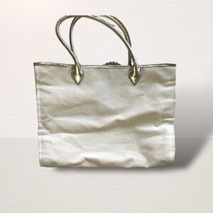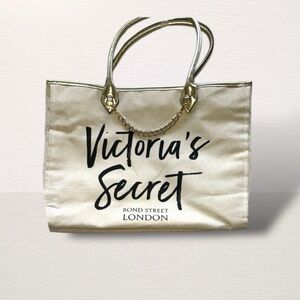 Victoria’s Secret Bond Street London Canvas Tote New Never Used. Cream colored canvas with black lettering. Gold handles and chain accent. Very wide. Approximate measurements in photos.