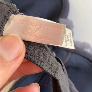 Dark gray bra with lavender lace accents. Has light padding and underwire. No flaws