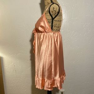 Victoria's Secret "Angels" slip dress, with bow in front, and elastic under bra area, peach in color, and ruffle hem, size large. Bust-armpit to armpit around 28 inches (not stretched), length 31 inches.