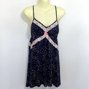 FROM VICTORIA’S SECRET, HERE IS AN ADORABLE VINTAGE BABY DOLL NIGHTIE. IT IS DONE IN COTTON AND ELASTANE, SO IT DOES HAVE STRETCH FOR COMFORT. THIS DARLING BABY DOLL IS DONE IN DARK BLUE WITH TINY PINK AND WHITE FLOWERS OVER IT. THIS VICTORIA’S SECRET FEATURE ADJUSTABLE LINGERIE STRAPS, A V NECK AND BACK THAT ARE TRIMMED IN LACE. THERE IS A LACE TRIM OVER THE BODICE WITH A SMALL PINK BOW, AND THE BUST IS LIGHTLY PADDED. THIS IS SO SWEET AND SEXY~EXCELLENT CONDITION, SIZE SMALL AND IT DOES HAVE STRETCH, BUT PLEASE NOTE THE MEASUREMENTS