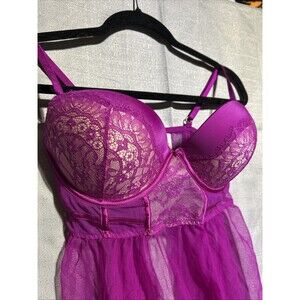 Victoria's Secret Babydoll Bra 36D Sexy Pink Purple Sheer Lace Padded Lingerie