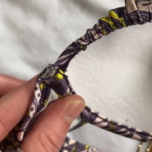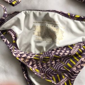 Size 34D top and Size xs bottoms. Bottoms are in perfect condition, but top is in good condition due to the fact that the tip of the underwire pops out a little bit sometimes. It is easy to push back inside and doesn't come out all the time. Doesn't affect wear very much, could be fixed with a sew.