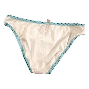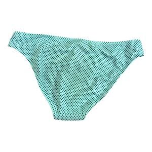 This Victoria's Secret bikini in teal with a black polka dot print features a cheeky swim bottom in size medium. Made from a polyamide blend material, the bikini bottom is designed with a stretch for comfort. The classic and sexy theme of the bikini, along with the signature Victoria's Secret logo, adds a touch of glamour to the beach-ready look. The hand wash only care instruction ensures the longevity of this stylish and flattering swimwear piece.