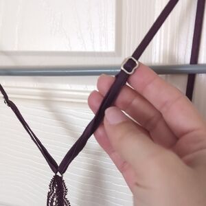 Elegant dark mahogany chemise with delicate lace trim. Features a flattering V-neck and adjustable straps. Great for hot temperature nights, oil stain in front, tried treating it washed and cleaned.