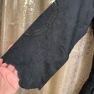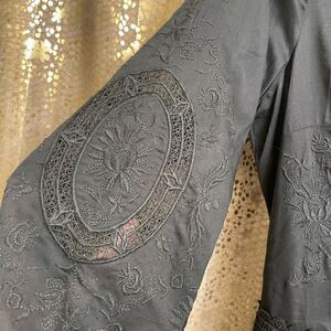 Beautiful from any angle. Black embroidery all over. There is no materials tag, but doesn't feel like there is much stretch. Material feels light, on the thinner side but not see through. The embroidered top torso portion however is semi sheer with see through embroidery. The waist portion has a little bit of smocking on the sides. Keyhole back of the neck. 3/4 sleeve length. Size 4, or small. See measurements below. This is from 2013, still has the extra button tags on it. Smoke and pet free home.