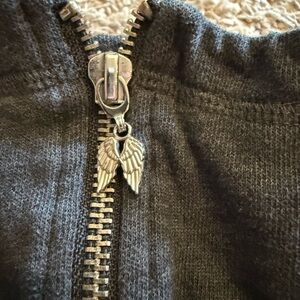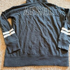 Chic gray sweatshirt with a half-zip design. Features stylish white stripes on the sleeves. Ideal for casual wear. Angel on back