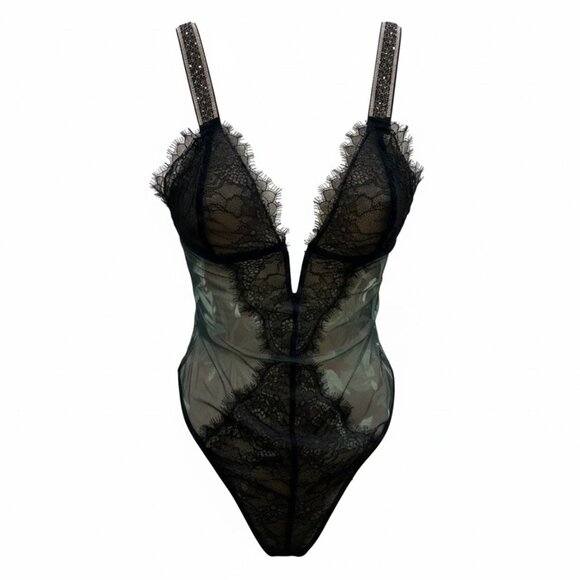 Chic black lace teddy thong with sheer accents. New with tags, size XL.