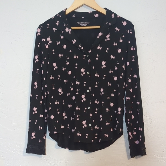 Victoria's Secret Black & Pink Floral Soft Cute Button Down Pajama Shirt NWT S
