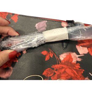 This spacious open tote bag features a bold floral design on a sleek black base with a vibrant red interior. Ideal for carrying essentials elegantly. New without tags.