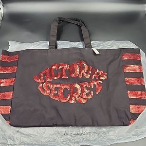 Victorias Secret Black Red Sequins Tote Large Travel Bag Valentines Day Lips NEW .