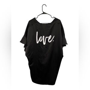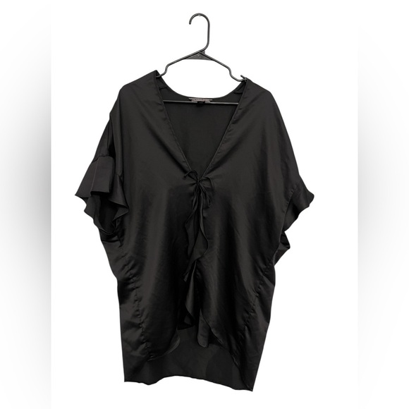 Elegant black satin robe. Features a tie front and loose sleeves. Perfect for lounging.