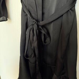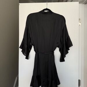 Very gently used. Black satin robe from Victoria's Secret. Has ruffle details on sleeves and hem. Slightly cropped sleeves. Has inside tie to secure it. Size XS/S - runs a little big.