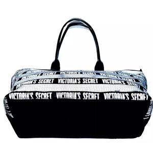This limited edition Victoria's Secret Weekender Bag is the perfect accessory for any occasion. The bag features a stunning black sequin and canvas exterior with silver accents and logo detailing. It has double handles and a zipper closure, making it easy to carry and secure your belongings.