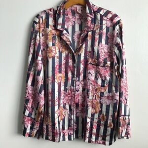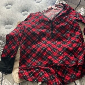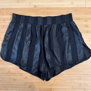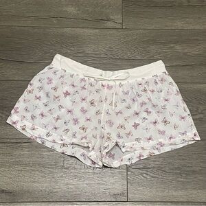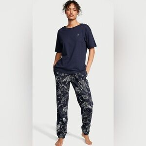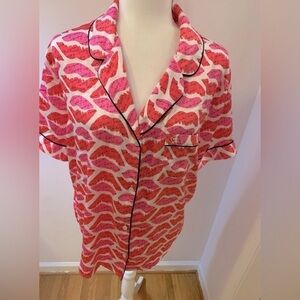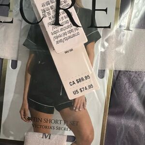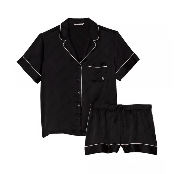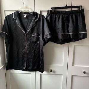 Elegant black sleepwear with white trim. Features a short-sleeve top and matching shorts.