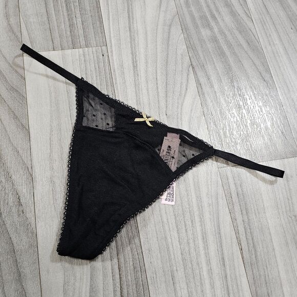 Victoria's Secret Black Stretch Cotton Polka Dot Mesh V-String Panty