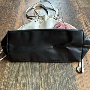 Victoria’s Secret black and white color block drawstring tote bag with pink interior lining. Features double shoulder straps, a roomy open compartment, and comes with detachable pink floral charm keychains. Interior has a blush pink lining with plenty of space for essentials. Great as a beach bag, gym tote, or everyday carryall. Some minor wear from prior use, overall good condition.