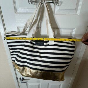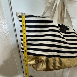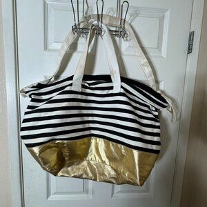 Victoria’s Secret Black White Striped Tote Bag Gold Bottom Large Travel Beach