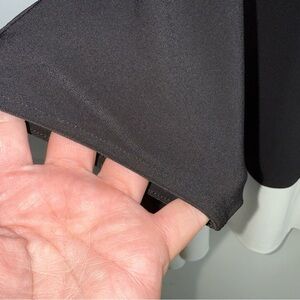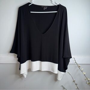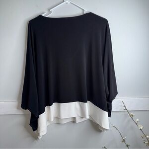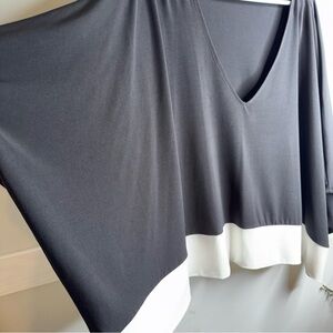 Elegant black blouse with white hem. V-neck design. Perfect for any occasion. Kimono sleeves