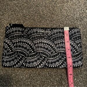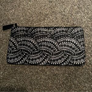 This Vera Bradley cosmetic bag features a sophisticated black and white color scheme with intricate beaded embellishments. The elegant wave-like pattern adds a touch of class, making it perfect for organizing your essentials in style. Its compact design and zipper closure ensure convenience and security for your small items.