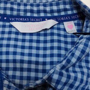 This charming gingham shirt dress by Victoria's Secret is crafted from breathable 100% cotton, offering a blend of comfort and style. Its button-up design, complete with roll-up sleeve tabs, provides versatile wear, transitioning effortlessly between casual and polished looks. The classic blue and white checkered pattern adds a timeless appeal to your wardrobe.
