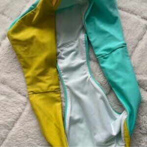 Details: Colorblock asymmetrical Bottoms. Gold logo plate on back. Full coverage. Can be worn with many different tops.