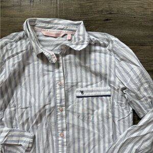 Experience ultimate comfort with this Victoria's Secret pajama set, featuring a chic gray and white striped design. Crafted from lightweight fabric, it's perfect for a cozy night's sleep or lounging around the house. Enjoy the blend of style and relaxation with this elegant sleepwear essential.