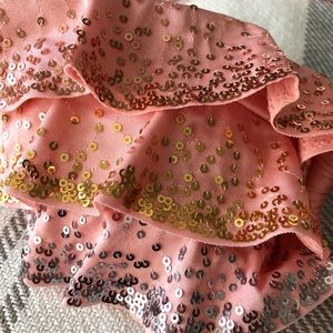 Details: gold, silver, rose gold sequins top. Satin type material. Can be worn strapless or as a halter. Has a liner with thin padding. Size M - can fit a 36 B, like new!!
