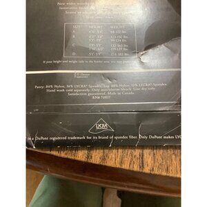 Pre-owned packaging shows creases and tears, but the pantyhose remain pristine.