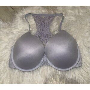 Women’s Victoria’s Secret Body By Victoria Racerback Perfect Shape bra, blue-gray color, front close, lightly padded, underwire, crossover lace detail in back