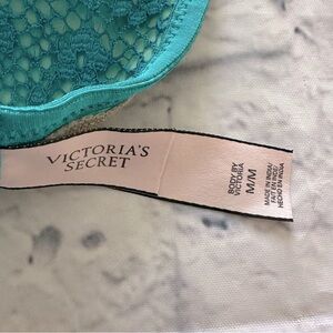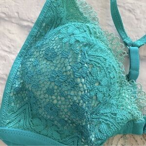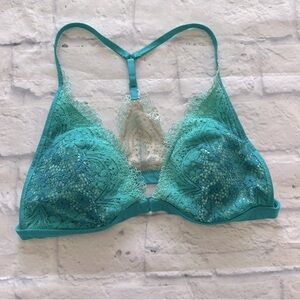 Magical and dreamy, this Victoria’s Secret Body by Victoria lace bralette comes in a stunning blue ombre shade that fades from aqua to swimming pool blue, giving it true mermaid or fairycore vibes. Designed with a front closure, triangle wireless lace cups, mesh lining, and removable padding, it offers both comfort and style. The racerback fit with adjustable straps and lace back piece add a chic finishing touch. Size Medium. Note: one removable pad has been replaced with a circular insert, which does not affect the shape or wear.
