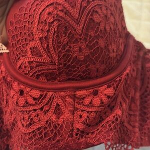 Adjustable straps that can be crossed over as well. Really cute lace and star details. Corset details and wiring. Deep red wine color. Some signs of wear on interior as pictured