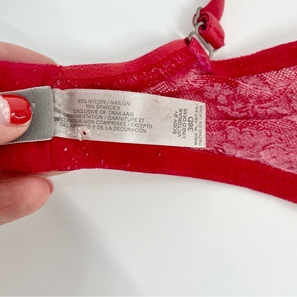 Victoria's Secret Body by Victoria Lined Demi Bra by 36D In Red Lace Overlay. Wired and padded bra. In excellent pre-owned condition.