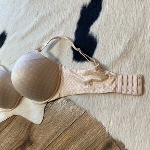 Design: Features a playful polka dot pattern (possibly white dots on a tan/beige background as seen in the image). The bra shown in the image appears to be a Demi or Plunge style, known for a lower cut and often a V-shape in the center.